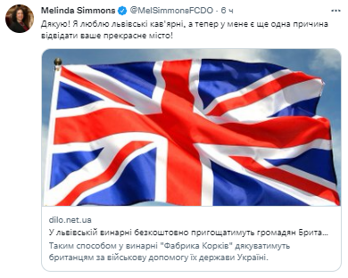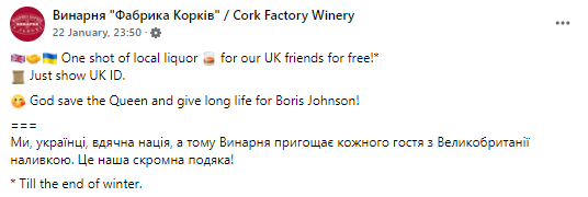 "Мы, украинцы, благодарная нация, и поэтому Винарня угощает каждого гостя из Великобритании с наливкой. Это наше скромное спасибо", - говорится в сообщении.