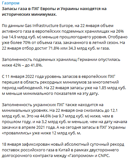 В "Газпроме" сообщают, что на 22 января объем активного газа в европейских хранилищах был на 26% меньше прошлогоднего уровня, отбор достиг 71,8% или 34,3 млрд кубометров