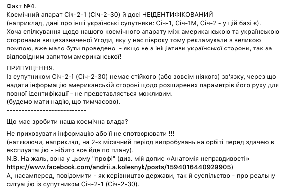 "Со спутником "Сич-2-1" нет устойчивой (или совсем никакой) связи, поэтому предоставить информацию американской стороне относительно расширенных параметров его движения для полной идентификации не представляется возможным (будем надеяться, что временно).