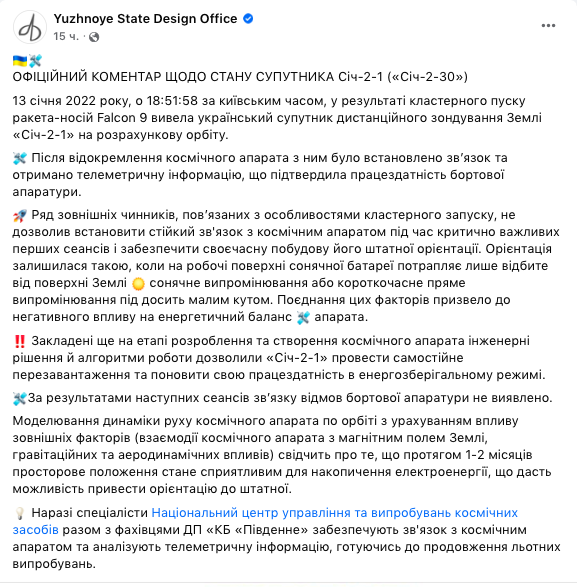 23 января бывший советник главы Государственного космического агентства Украины Андрей Колесник написал в Facebook, что по прошествии десяти дней после запуска "Сич" до сих пор не вышел на связь.