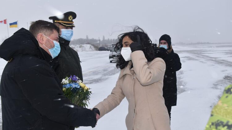 Анита Ананд прилетела в Украину с делегацией. В Киеве делегацию встречал заместитель министра обороны Александр Полищук.