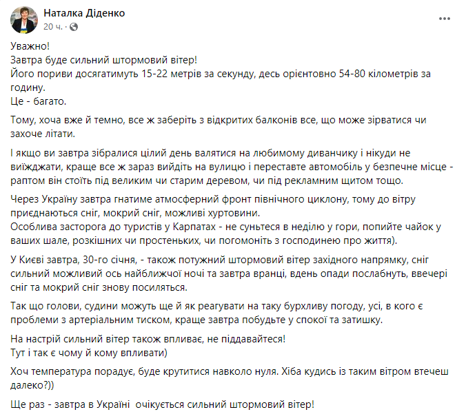 Вечером в последнее воскресенья января Украину накроет сильный штормовой ветер. Его порывы будут достигать 15-22 метров в секунду, примерно 54-80 километров в час.