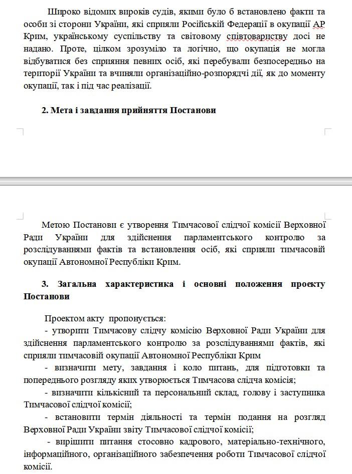 Согласно пояснительной записке, задача временной следственной комиссии - осуществление парламентского контроля за расследованием фактов и установлением лиц, которые способствовали захвату полуострова.