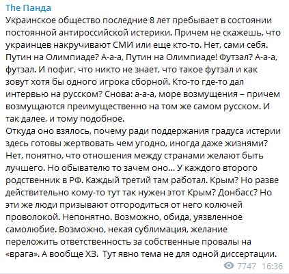 "Украинское общество последние 8 лет пребывает в состоянии постоянной антироссийской истерики. Причем не скажешь, что украинцев накручивают СМИ или еще кто-то. Нет, сами себя. Путин на Олимпиаде? А-а-а, Путин на Олимпиаде! Футзал? А-а-а, футзал. И пофиг, что никто не знает, что такое футзал и как зовут хотя бы одного игрока сборной. Кто-то где-то дал интервью на русском? Снова: а-а-а, море возмущения – причем возмущаются преимущественно на том же самом русском. И так далее, и тому подобное.
