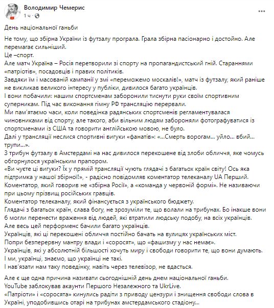 И мы, украинцы, знаем, что украинцы не такие. И навязать нам такое поведение даже через телевизор не удастся. Но есть еще одна причина называть сегодняшний день днем ​​национального позора. YouTube заблокировал аккаунты Первого Независимого и UkrLive. "Патриоты" и "соросята" бросились радоваться цензуре и уничтожению свободы слова в Украине, уподобившись стадам на трибунах амстердамского стадиона…", - написал политический эксперт Владимир Чемерис.