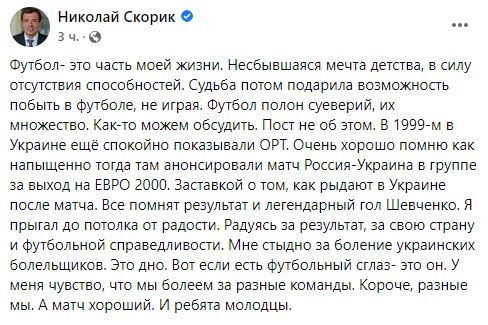 "Футбол - это часть моей жизни. Несбывшаяся мечта детства, в силу отсутствия способностей. Судьба потом подарила возможность побыть в футболе, не играя. Футбол полон суеверий, их множество. Как-то можем обсудить. Пост не об этом. В 1999-м в Украине ещё спокойно показывали ОРТ. Очень хорошо помню как напыщенно тогда там анонсировали матч Россия-Украина в группе за выход на ЕВРО 2000. Заставкой о том, как рыдают в Украине после матча. Все помнят результат и легендарный гол Шевченко. Я прыгал до потолка от радости. Радуясь за результат, за свою страну и футбольной справедливости. Мне стыдно за боление украинских болельщиков. Это дно. Вот если есть футбольный сглаз- это он. У меня чувство, что мы болеем за разные команды. Короче, разные мы. А матч хороший. И ребята молодцы", - прокомментировал нардеп от ОПЗЖ Николай Скорик.