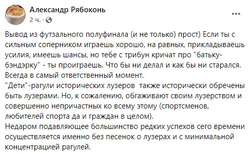 "Вывод из футзального полуфинала (и не только) прост) Если ты с сильным соперником играешь хорошо, на равных, прикладываешь усилия, имеешь шансы, но тебе с трибун кричат про "батьку-бэндэрку" - ты проиграешь. Что бы ни делал и как бы ни старался. Всегда в самый ответственный момент.