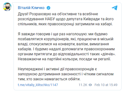 "Друзья! Рассчитываю на объективное и всестороннее расследование НАБУ в отношении депутата Киевсовета и его подельников, которых правоохранители задержали на взятке", - написал мэр.