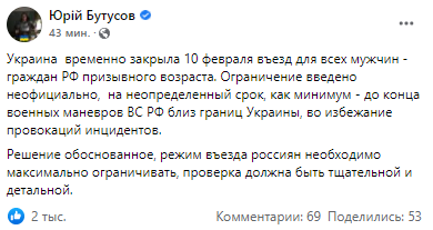 "Украина временно закрыла 10 февраля въезд для всех мужчин - граждан РФ призывного возраста. Ограничение введено неофициально, на неопределенный срок, как минимум - до конца военных маневров ВС РФ близ границ Украины, во избежание провокаций инцидентов", - говорится в сообщении.