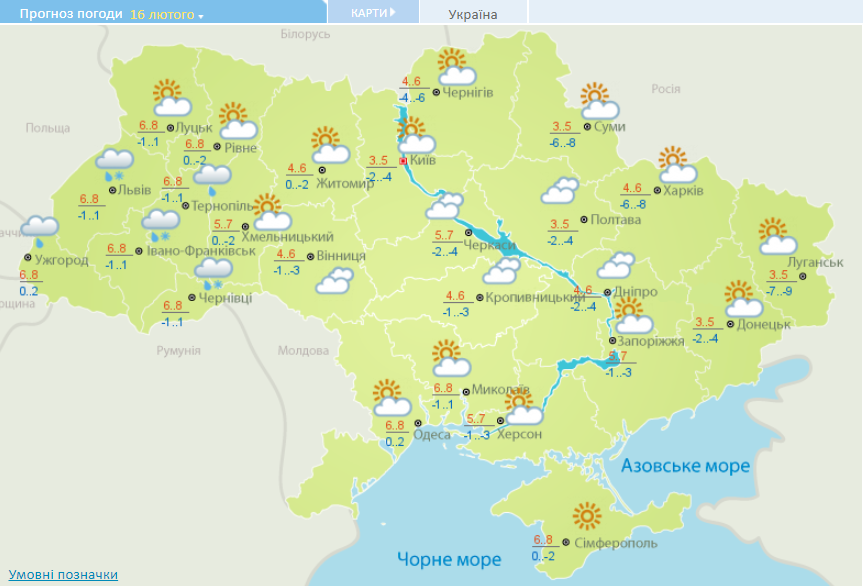 В среду, 16 февраля, в Украине ожидается переменно облачная погода без существенных осадков, только в Закарпатье и Прикарпатье возможен небольшой дождь с мокрым снегом. Об этом сообщает Украинский гидрометцентр.