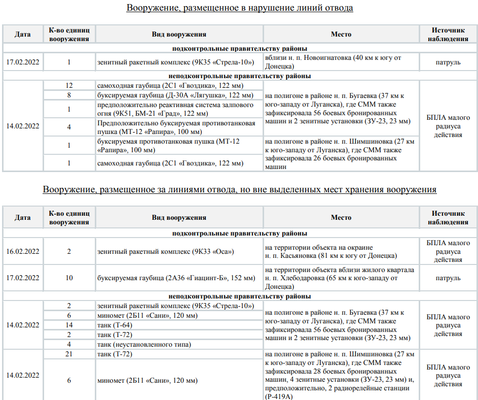 Они также зафиксировали 21 гаубицу, 5 противотанковых пушек (4 из них предположительные) и, предположительно, 1 реактивную систему залпового огня на 2 полигонах в неподконтрольных правительству районах Луганской области", - говорится в отчете.