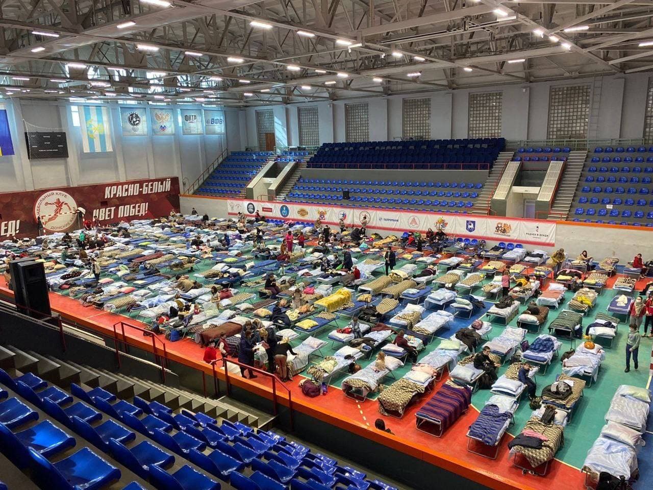 Есть те, кому повезло меньше. Их селят в российские школы или дворцы спорта. Фотографии таких временных пристанищ вчера облетели Сеть. На одном из фото - стройные ряды раскладушек прямо на стадионе.