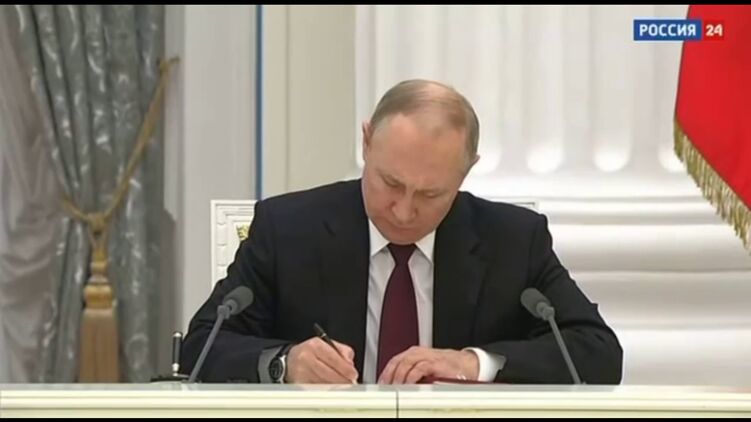 После этого в Кремле Путин подписал соответствующий указ о признании "республик". При подписании присутствовали "главы" "ЛНР" и "ДНР" Леонид Пасечник и Денис Пушилин.