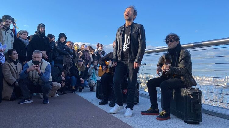 Лидер украинской группы "Океан Эльзы",  судья проекта "Голос страны-12", Святослав Вакарчук в Киеве на пешеходно-велосипедном мосту днем, во вторник, 22 февраля, дал концерт под открытым небом. Он спел несколько песен, таким образом отреагировав на признание Москвой "ДНР" и "ЛНР".