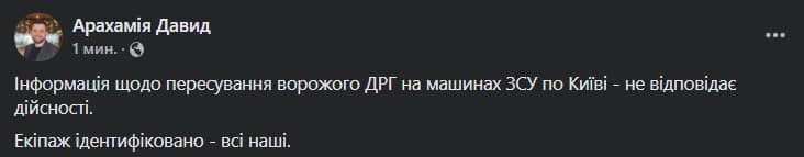 09:48 А вот "слуга народа" Давид Арахамия заявил, что передвижения вражеской ДРГ на машинах ВСУ в Киеве - это фейк, а военные оказались украинцами.