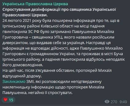 Поскольку он также оказался священником УПЦ, пресс-служба Украинской православной церкви призвала СМИ, которые выставили его как диверсанта, опубликовать опровержение.