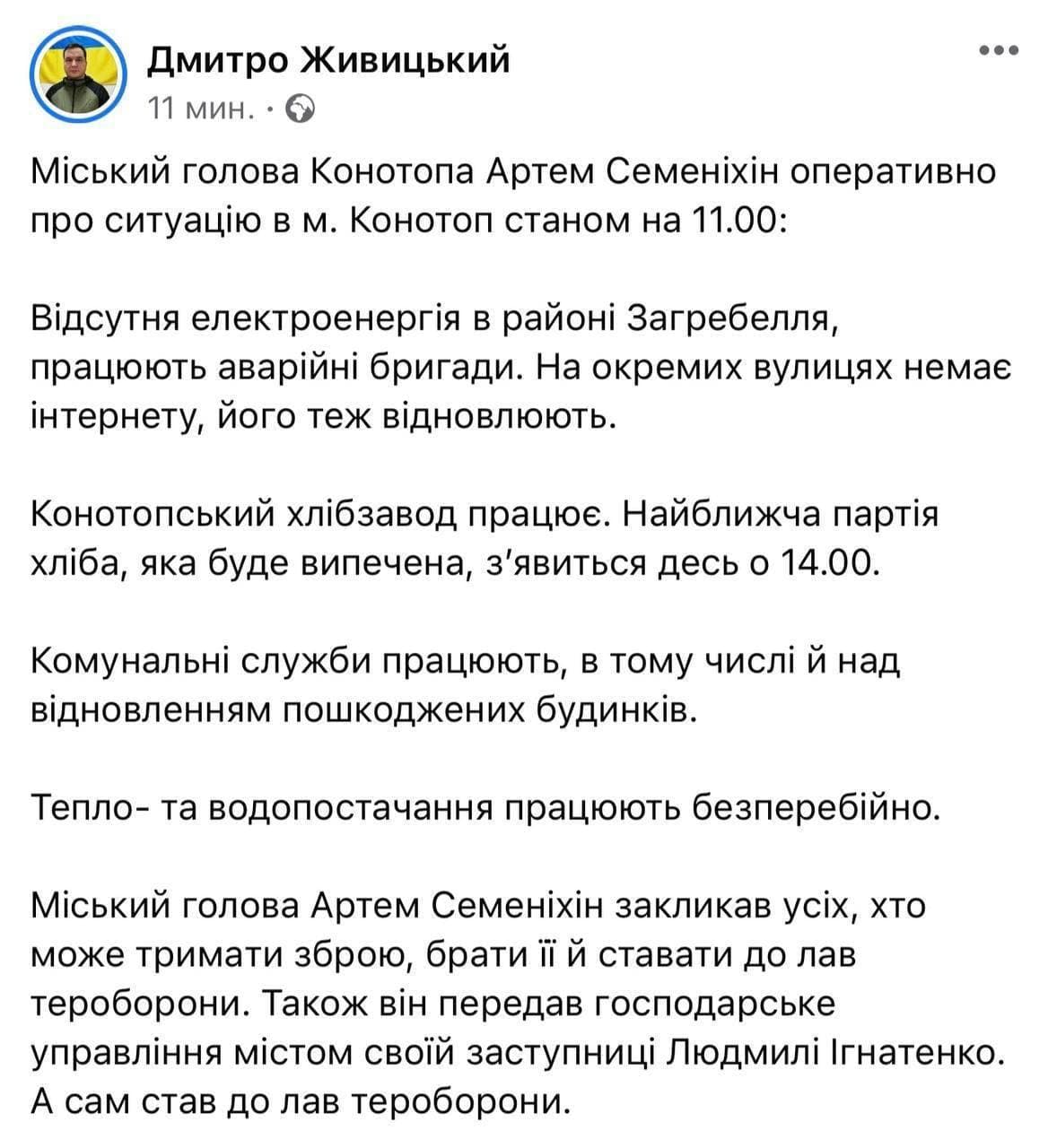 07:58 МВД Украины подтверждает, что Конотоп окружен российскими войсками, в Сумах идут уличные бои.
