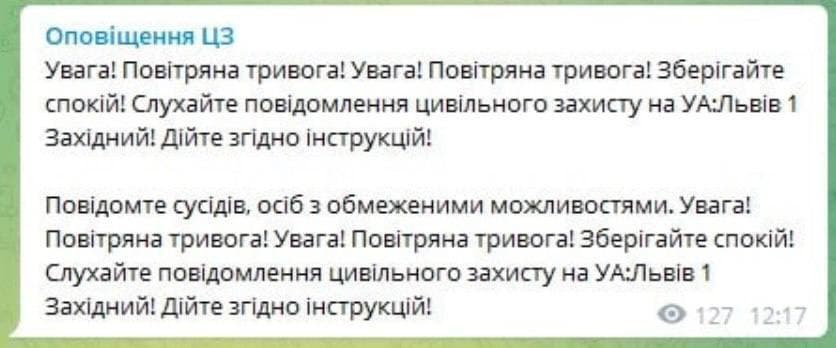 07:20 В Киеве и Львове включили сирены противовоздушной тревоги и говорят, что это не учебная, а боевая тревога.