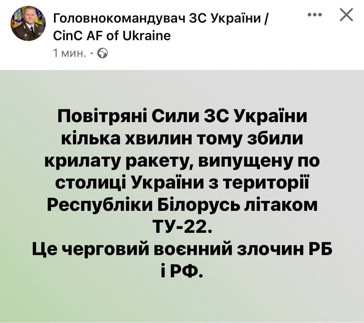 12:10 Губернатор Волынской области сообщил, что по воинской части около города Владимир нанесён ракетный удар из Беларуси.