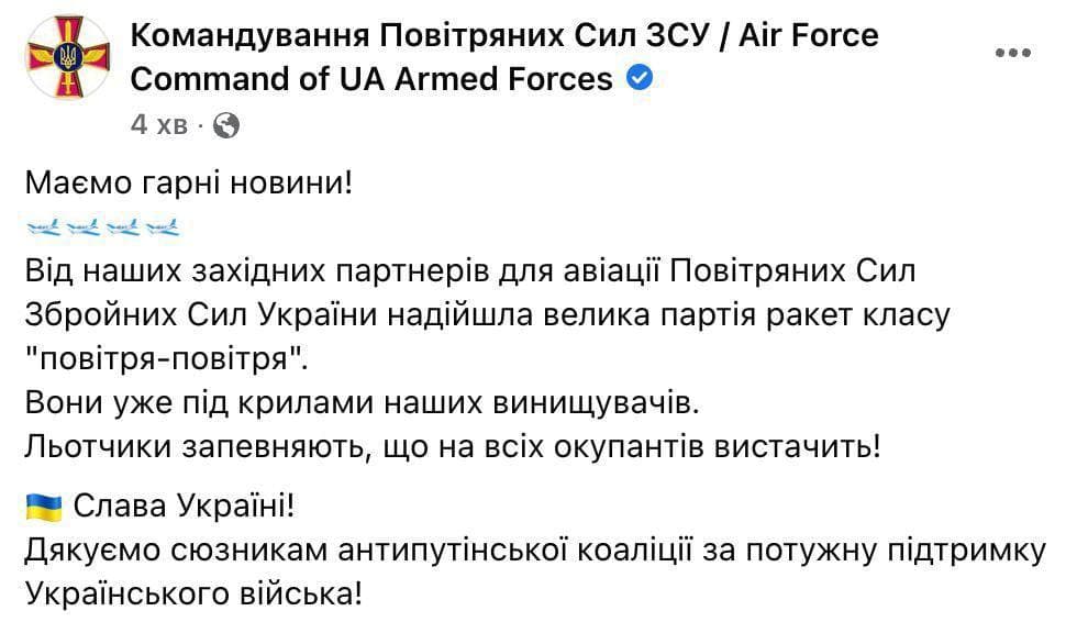12:08 ВВС Украины объявили о получении крупной партии ракет класса воздух-воздух от западных партнеров.