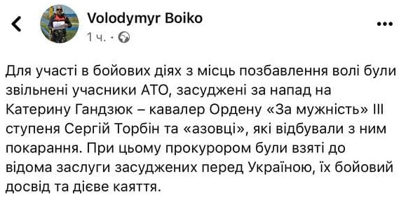 - осужденный за организацию нападения на херсонскую активистку Екатерину Гандзюк Сергей Торбин. Ему разрешили взять в подразделение еще десяток человек, которых он также выбрал из осужденных