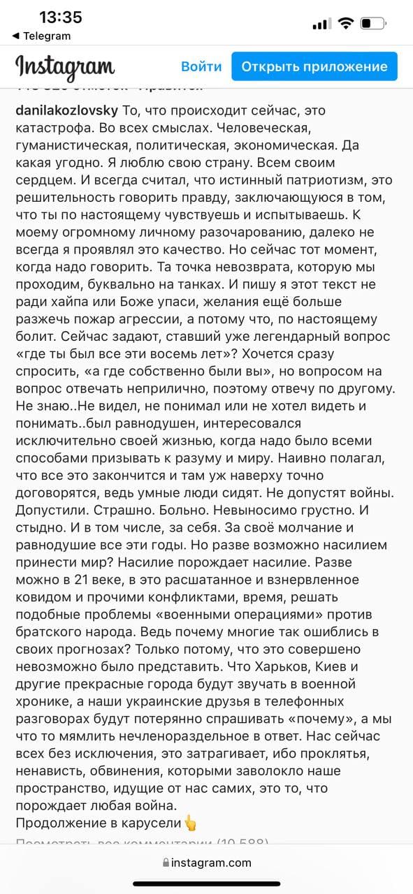 14:37 Популярный российский актёр Данила Козловский призвал Путина остановить войну в Украине.