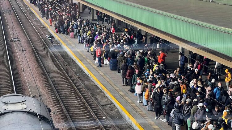Киевляне пытаются выехать из столицы, к которой приближаются военные действия. Появилось фото, как на железнодорожном вокзале эвакуационный поезд ожидают сотни женщин и детей.