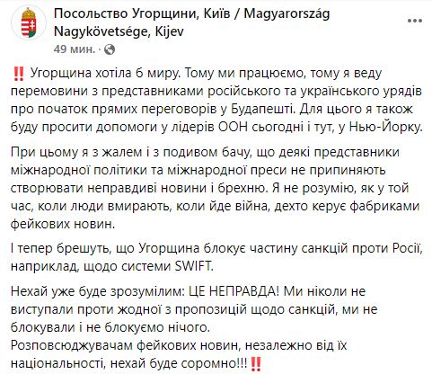 Пусть уже будет понятно: ЭТО НЕПРАВДА! Мы никогда не выступали против ни одного из предложений по санкциям, мы не блокировали и не блокируем ничего. Распространителям фейковых новостей, независимо от их национальности, да будет стыдно!" - сказал глава МИД Венгрии.