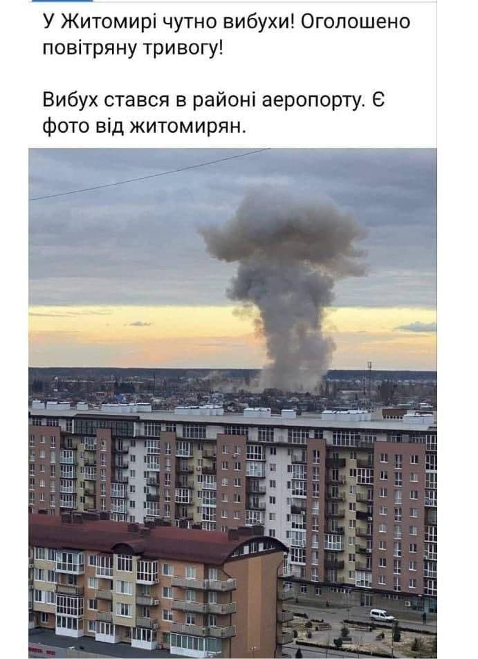17:54 Из Житомира сообщают о взрыве в районе аэропорта. Объявлена воздушная тревога.