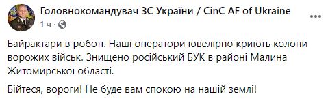 21:55 Под Малином в Житомирской области "Байрактаром" уничтожили российский БУК, сообщают в ВСУ.