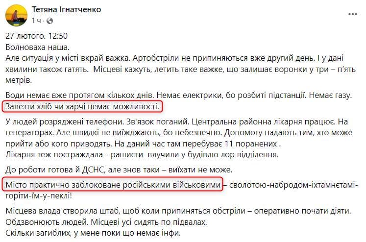 "Город практически заблокирован российскими военными", - написала она в Facebook. По ее словам, подвоз еды и лекарств в Волноваху невозможен.