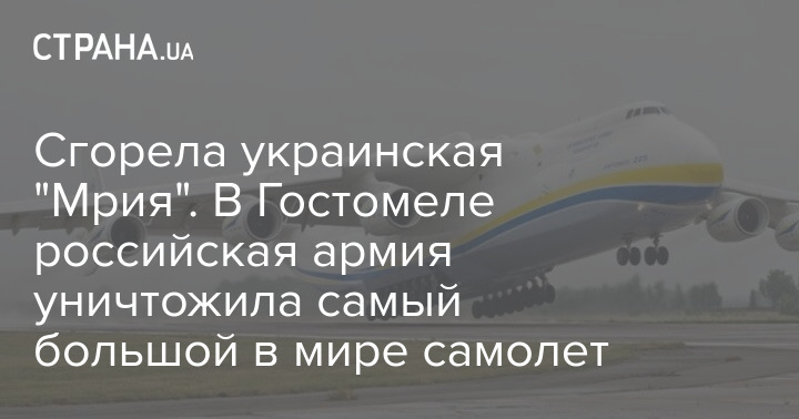 Один из самых больших и мощных транспортных самолетов в мире украинского производства АН-225 "Мрия", который находился в ангаре под Киевом, сожжен в результате атаки российской армии 24 февраля на аэропорт Гостомель.