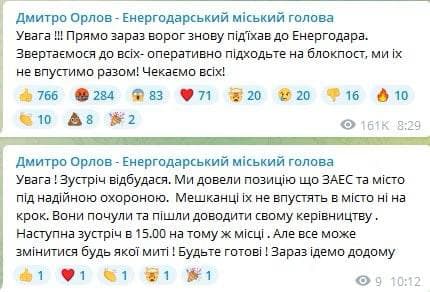 10.20 Мэр Энергодара сообщает, что представители российских войск встретились на блок-посту с жителями, те им сказали, что в город не пустят.