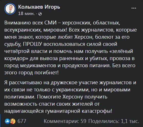20:08 Мэр Херсона Колыхаев переговорил с представителями российской армии, которые захватили город. Он сказал, что не пошёл с ними на сотрудничество, но сделал акцент, что будет заниматься обеспечением жизнедеятельности города и теперь в нем установлены такие правила:
