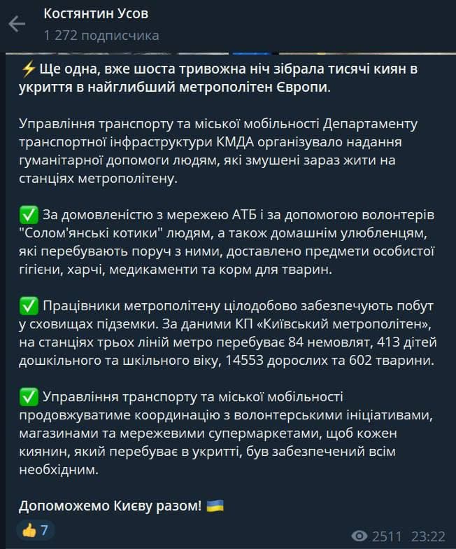 09:53 В Киеве ночь прошла спокойно, с утра открылись магазины и аптеки, работает транспорт и гуманитарный штаб, сообщает КГГА.