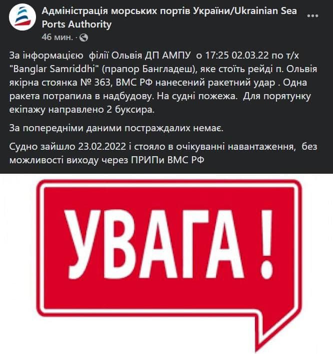 Удар зафиксирован в 17:25. Одна ракета попала в пристройку, начался пожар. На спасение экипажа направили 2 буксира. Предварительно - без пострадавших.