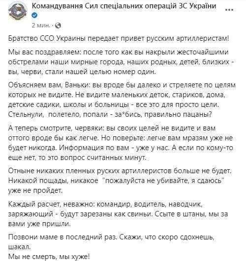 20:01 Силы специальных операций Украины обещают не брать живыми в плен российских артиллеристов.