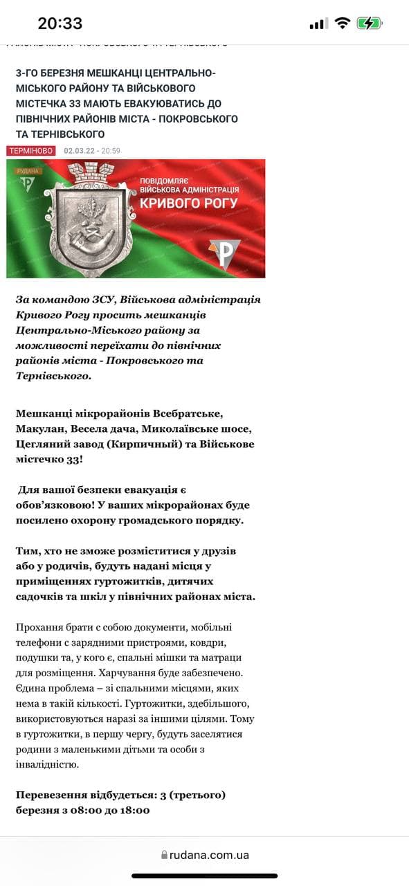 21:35 В Кривом Роге завтра будет эвакуация десятков тысяч людей. Военная администрация сказала перевезти людей подальше от военных городков и военных частей.