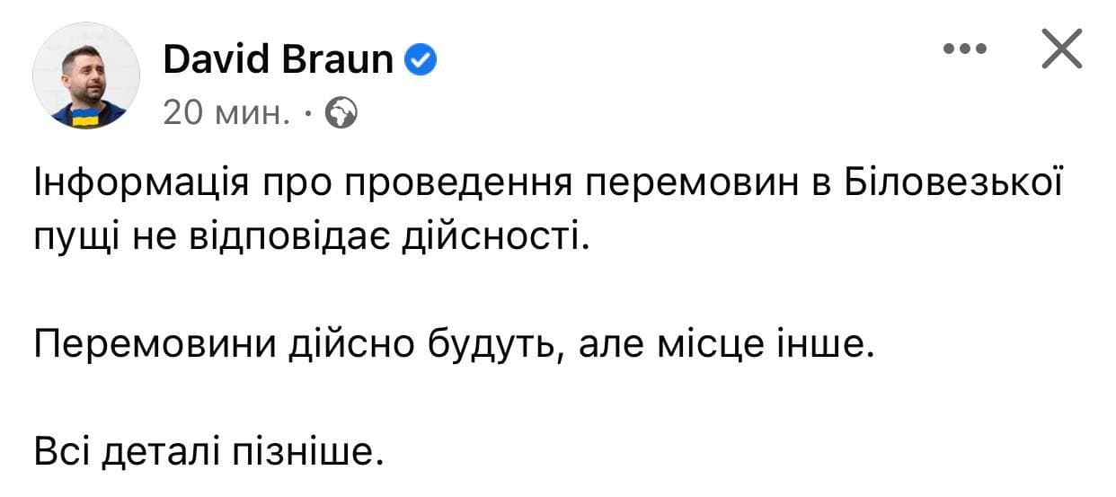 22:50 Арахамия говорит, что переговоры будут не в Беловежской пуще, а в другом месте.