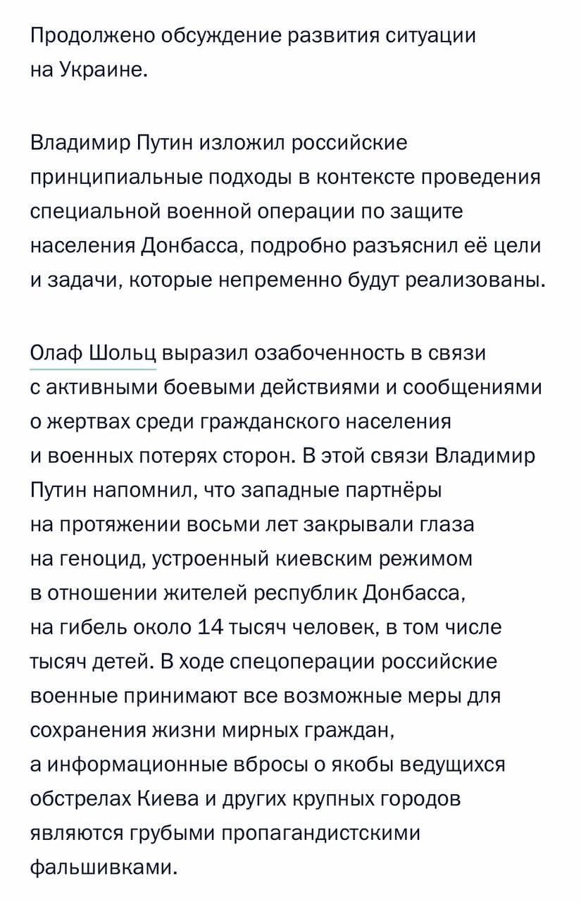 18:14 Вот полная версия Кремля по поводу переговоров Путина и Шольца.