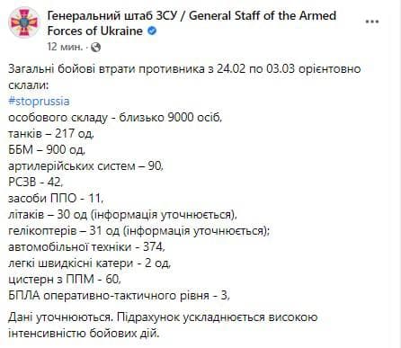09:50 А вот сводка от Генштаба ВСУ по потерям российских войск. В ВСУ заявляют, что армия РФ уже потеряла убитыми 9000 человек.