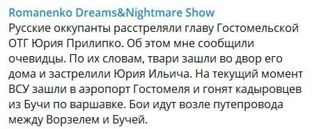 19.50 А вот сводка ГУР МО о ситуации в Гостомеле. Пишут, что город под украинским контролем сейчас.