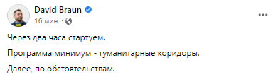 "Через два часа стартуем. Программа минимум - гуманитарные коридоры. Далее, по обстоятельствам", - говорится в сообщении.