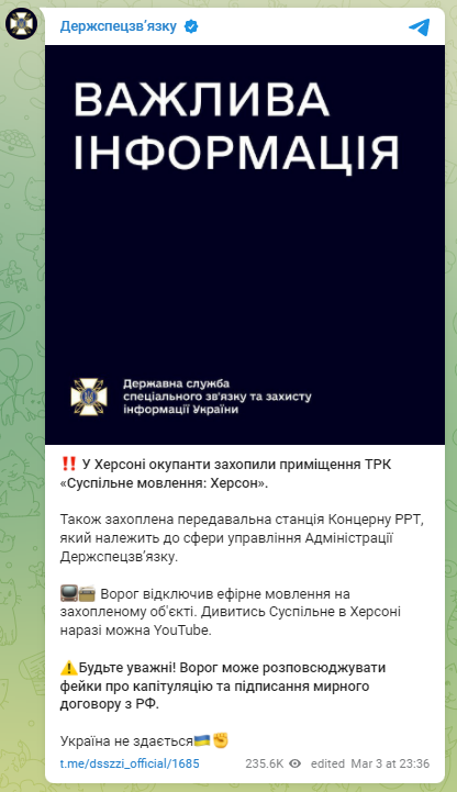 Государственная служба специальной связи и защиты информации Украины заявляет о том, что россияне захватили Суспильне.Херсон, а также передатчик Концерна РРТ (который транслирует сигналы телекомпаний).