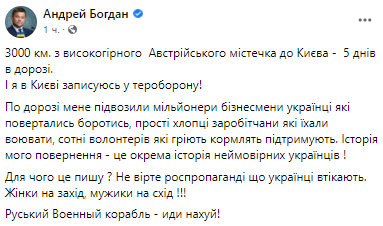 Экс-глава Офиса президента Андрей Богдан вернулся в Киев и записался в тероборону. По его словам, добирался он 5 дней.