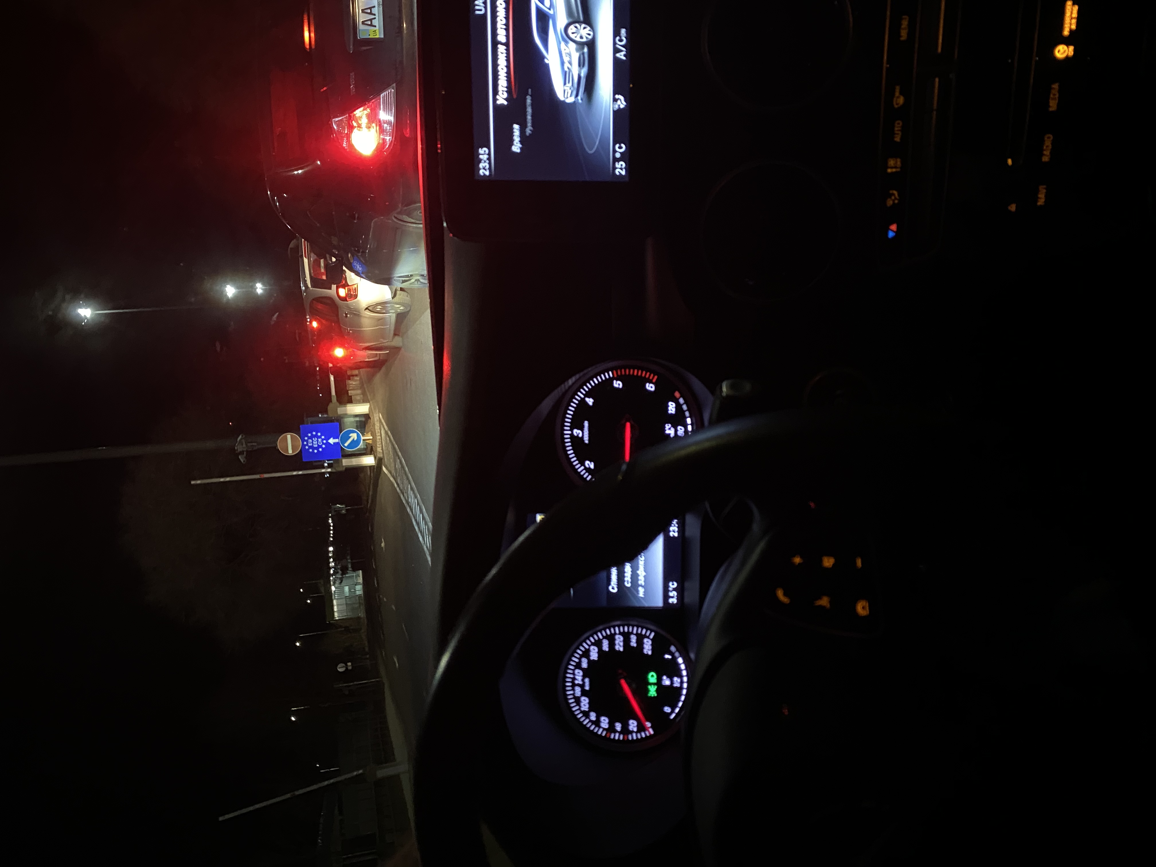 Мы приехали на границу около 15:30. До пункта пропуска оставалось всего 650 м. В очереди мы были примерно 55-й машиной по счёту. Все стояли очень организовано, лишь пару раз особо хитрые пытались проскочить без очереди.