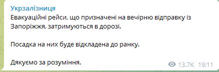 В "Укрзализнице" уточнили, что эвакуационные рейсы, назначенные на вечернюю отправку из Запорожья, задерживаются в пути. Посадка на них будет отложена до утра.