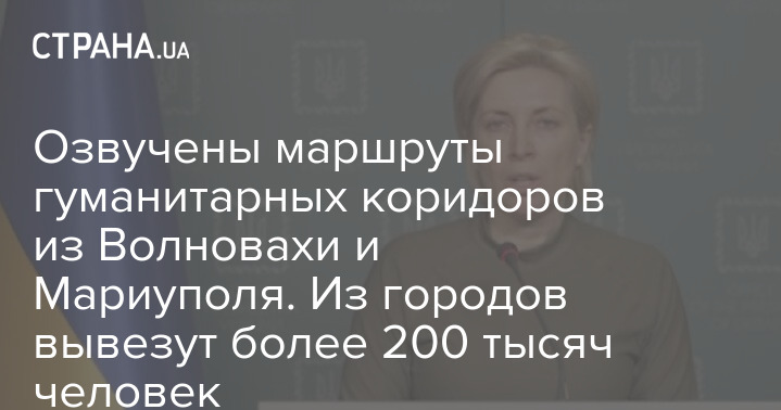 Вице-премьер-министр – министр по вопросам реинтеграции временно оккупированных территорий Украины Ирина Верещук рассказала об организованных сегодня гуманитарных коридорах в Мариуполе и Волновахе.