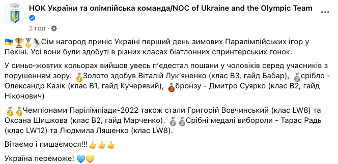 "Семь наград принес Украине первый день зимних Паралимпийских игр в Пекине. Все они были добыты в разных классах биатлонных спринтерских гонок", - говорится в сообщении.