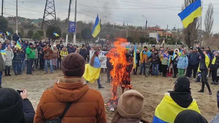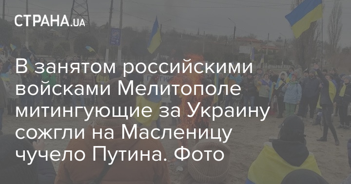 В Мелитополе, который на данный момент подконтролен российским войскам, на митинге за Украину сожгли чучело Путина.